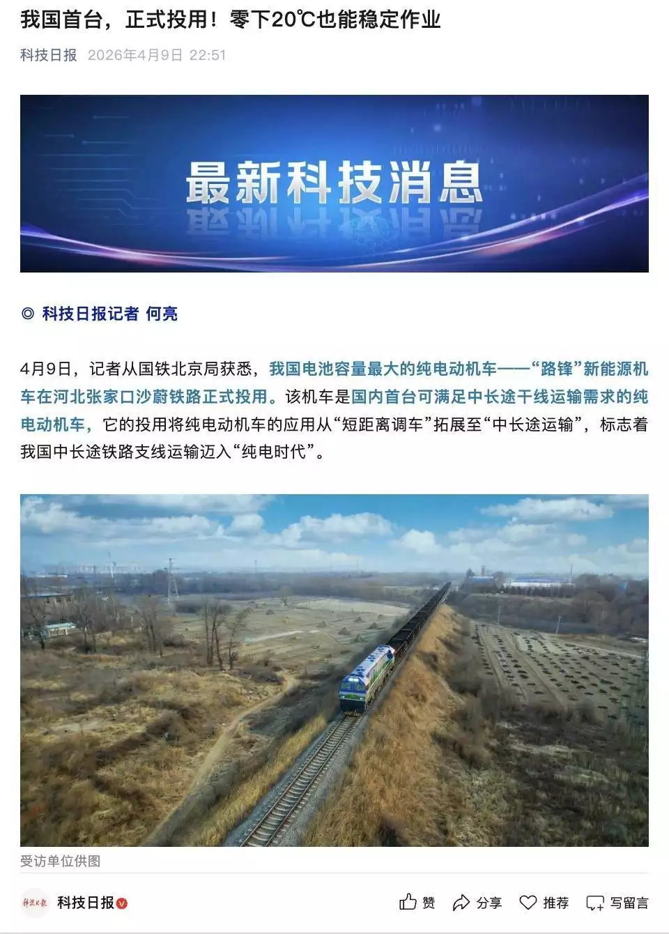 IT之家 4 月 10 日消息,据《科技日报》4 月 9 日报道,我国电池容量最大的纯电动机车 ——“路锋”新能源机车在河北张家口沙蔚铁路正式投用。该机车是国内首台可满足中长途干线运输需求的纯电动机车,它的投用将纯电动机车的应用从“短距离调车”拓展至“中长途运输”,标志着我国中长途铁路支线运输迈入“纯电时代”。
