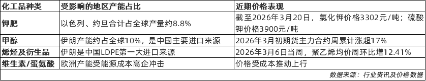 地缘冲突的影响已沿着产业链深入至具体化工品领域。伊朗等中东地区是全球多种化工品的重要生产基地,其供应中断导致相关产品价格获得强力支撑。需要重点关注中东及欧洲产能占比较大的品种,其供需紧平衡格局可能持续。